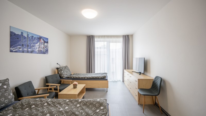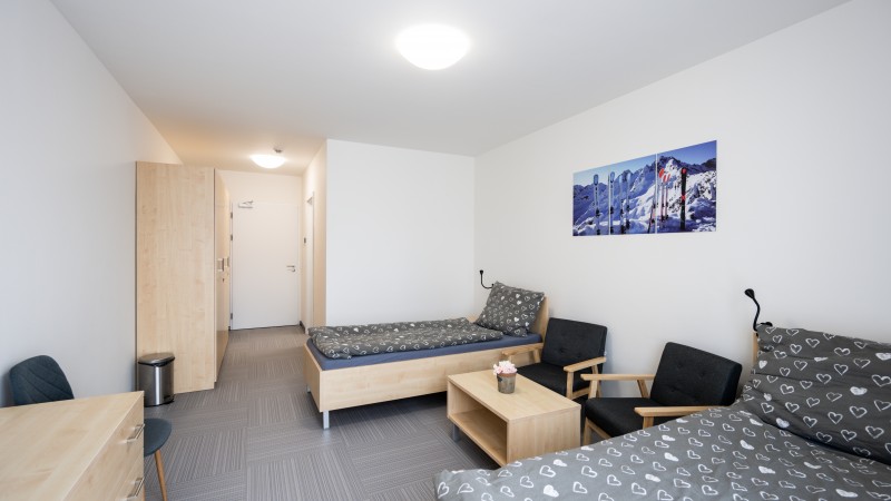 Modernly furnished double rooms with a size of 20 - 28 m2 are equipped with a double bed or twin beds, a TV, a bathroom with a shower, a toilet and ladder heating. Towels, soap and a hairdryer are provided in the bathroom. Each room has a spacious chest of drawers and a large wardrobe, which offers plenty of storage space for personal belongings and clothes. Some rooms have a terrace. Wi-Fi is free for all guests. Garage parking space for cars is available for a fee of 100 CZK/day. Guests can also use a shared kitchenette and a common room. Reception opening hours are from 8 am until 4 pm. Check-in is possible from 2 pm to 4 pm, check-out until 10 am.